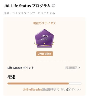 JMB elite plus グレードの500ポイントまで残り42ポイント。
